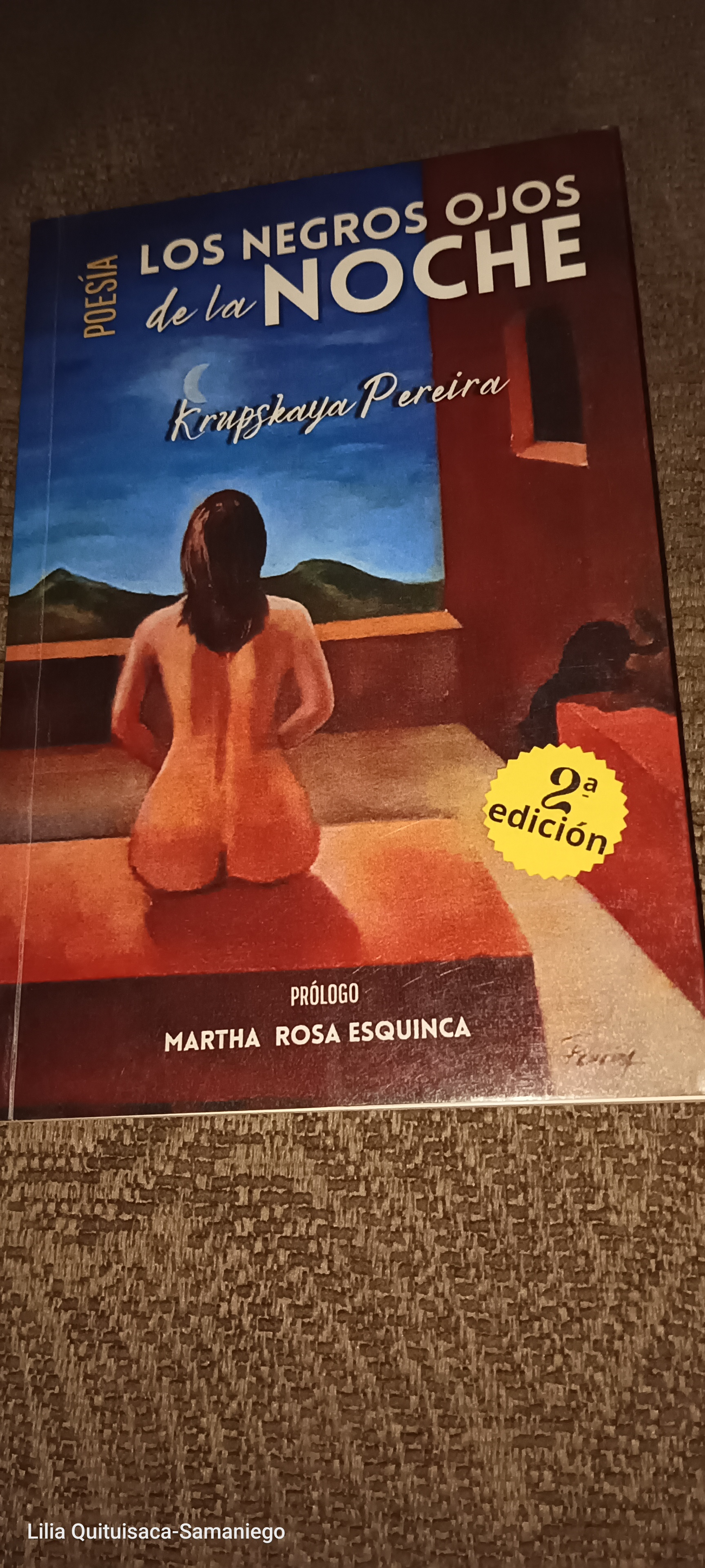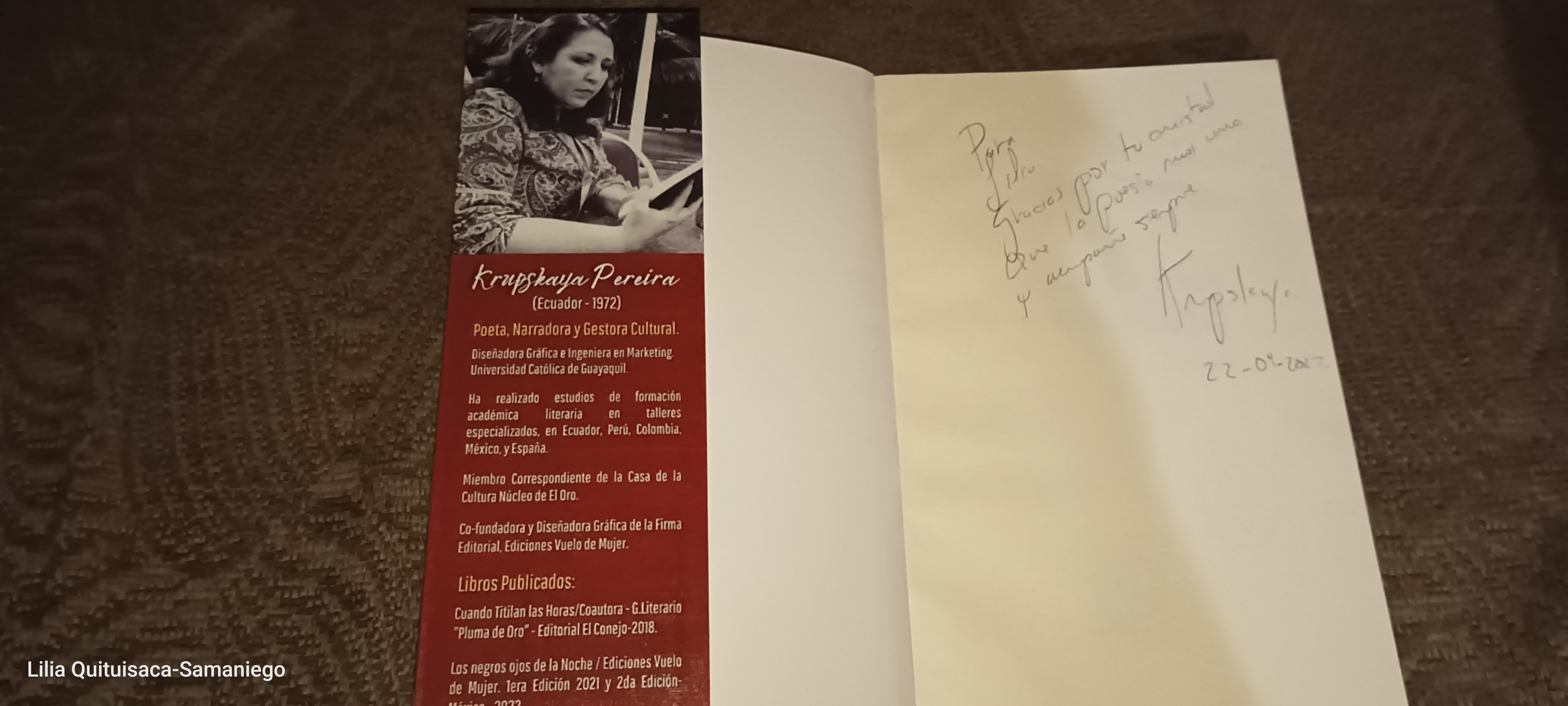 Los ojos negros de la noche, poesía que da título al libro de Krupskaya Pereira, ejemplar que recibí de sus manos en el mes de septiembre, cuando coincidimos en el Paralelo Cero 2022. Su generosidad es proporcional a su amplia sonrisa.